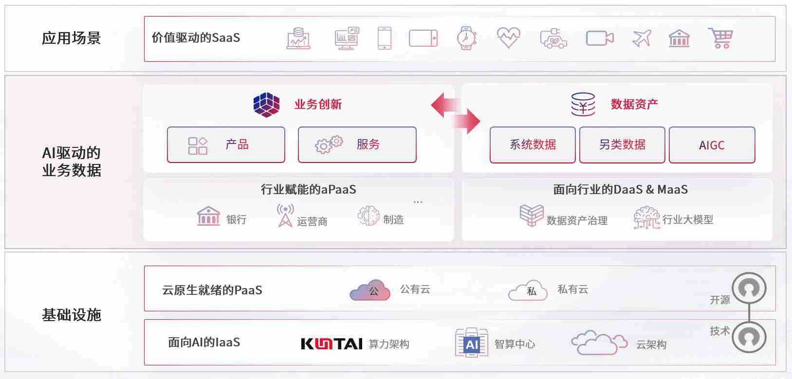 数字时代,,,,围绕企业数字化转型的关键要素,,开元数码开创性的提出数云融合战略和技术体系框架,,,,着力在云原生、、、数字原生、、AI原生和信创产业上架构产品和服务能力,,,,为处在不同数字化转型阶段的快消零售、、、汽车、、金融、、、、医疗、、政企、、、教育、、运营商等行业客户提供泛在的敏捷IT能力和融合的数据驱动能力,,构建跨界融合创新的数字业务场景和新业务模式,,助力企业级客户建立面向未来的核心能力和竞争优势,,,全面推动社会的数字化、、、、智能化转型升级。。。